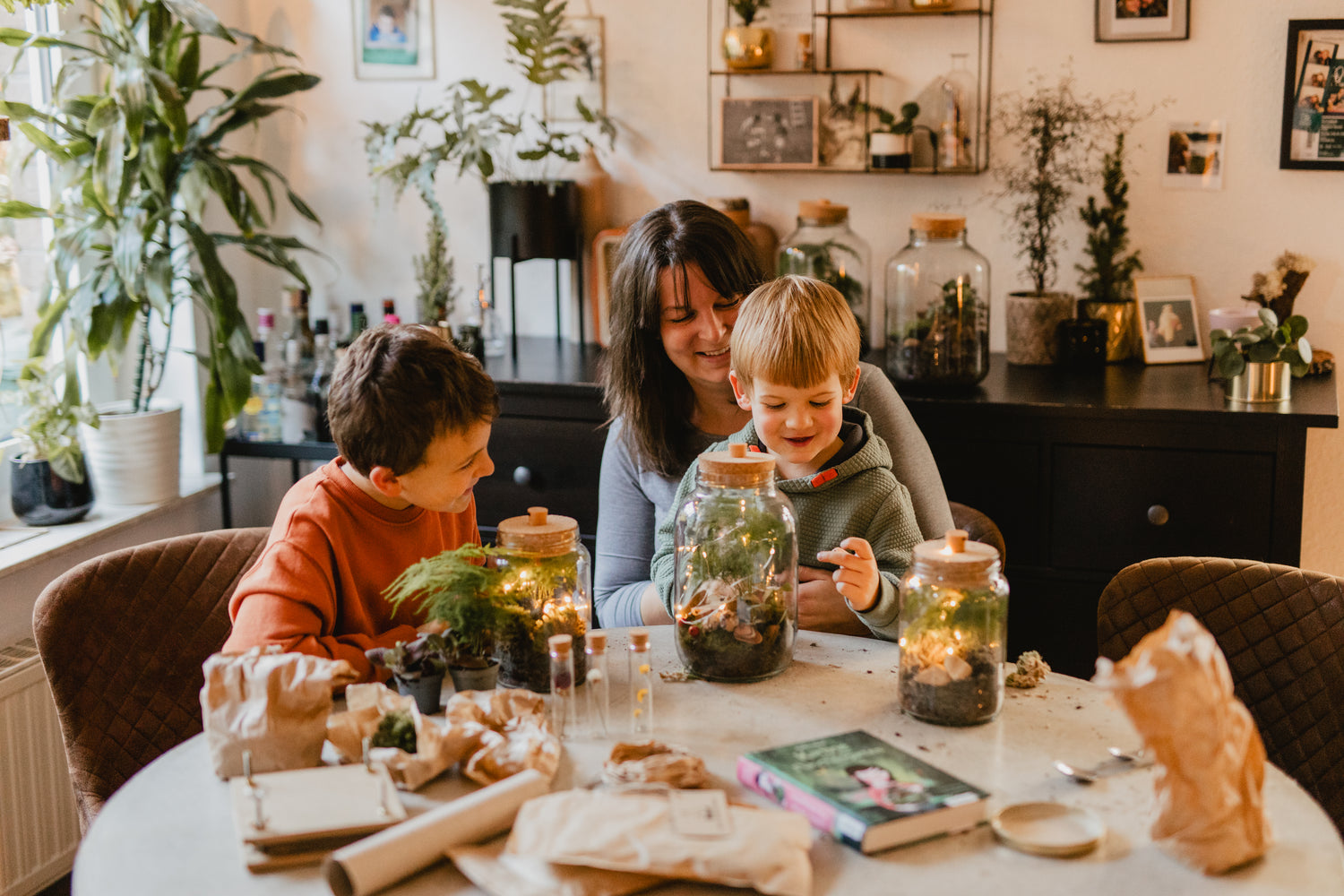 Zuerst wird gemeinsam gelesen, dann gebastelt, gepflanzt und gestaunt: Im 2-Liter-Glas entsteht ein Mini-Wald mit robuster Spargelpflanze. Dazu kommt ein LED-Korken für stimmungsvolles Licht und – Highlight! – eine süße kleine Wichteltür, die an den Moosballen gesteckt wird und, genau wie im Buch, dem Wichtel ein Zuhause bietet. 🧙