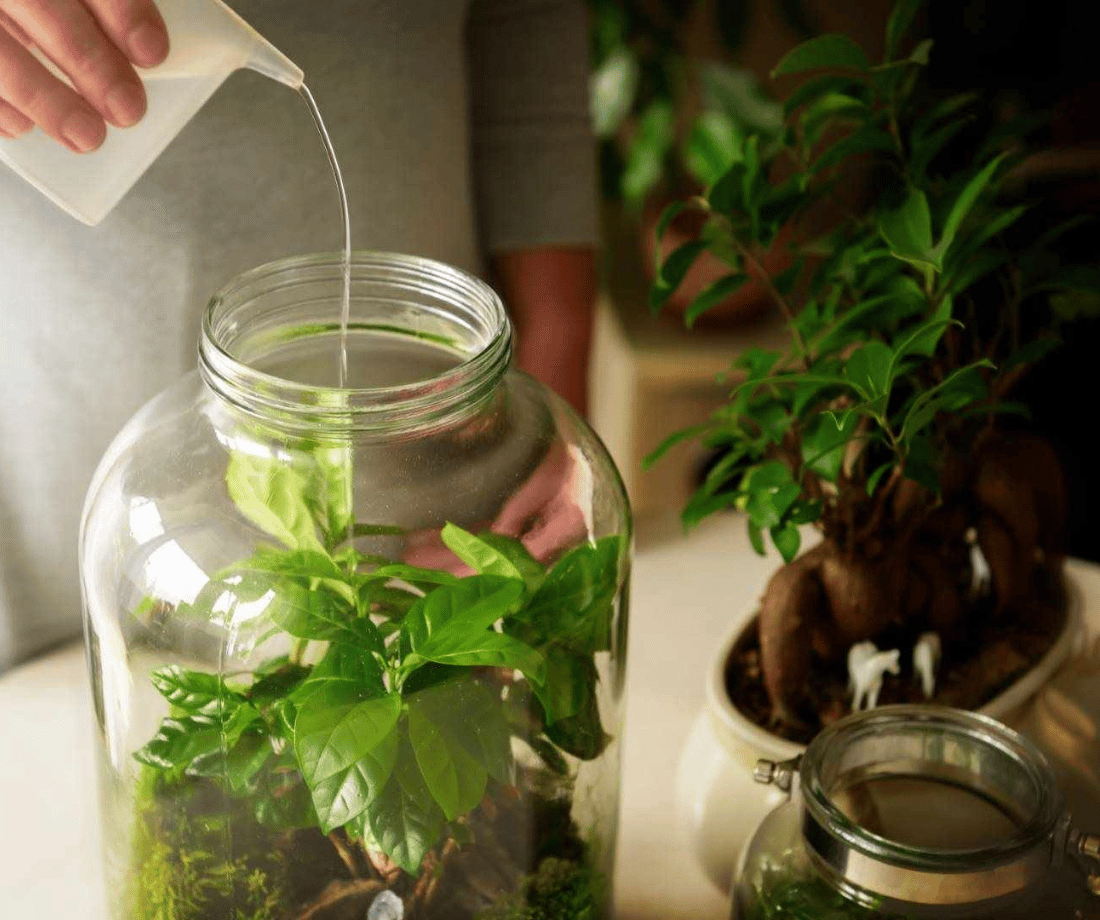 Der Flaschengarten muss nie gegossen werden - die Welt im Glas ist also auch besonders gut für diejenigen geeignet, die keinen besonders grünen Daumen haben; Das kleine Ökosystem erhält sich selbst - maximal die Zweige des Baumes sollten alle paar Monate gestutzt werden.
