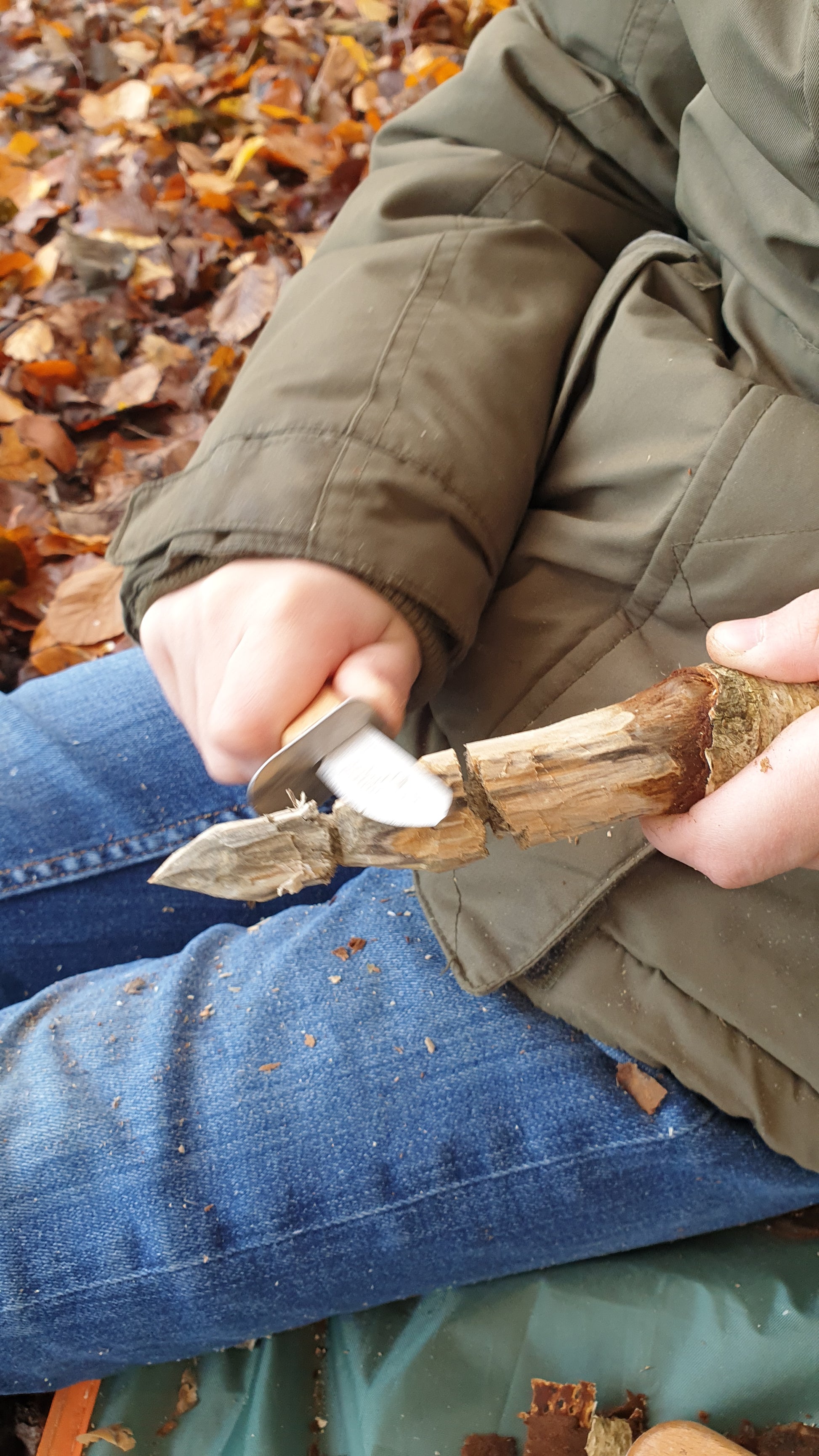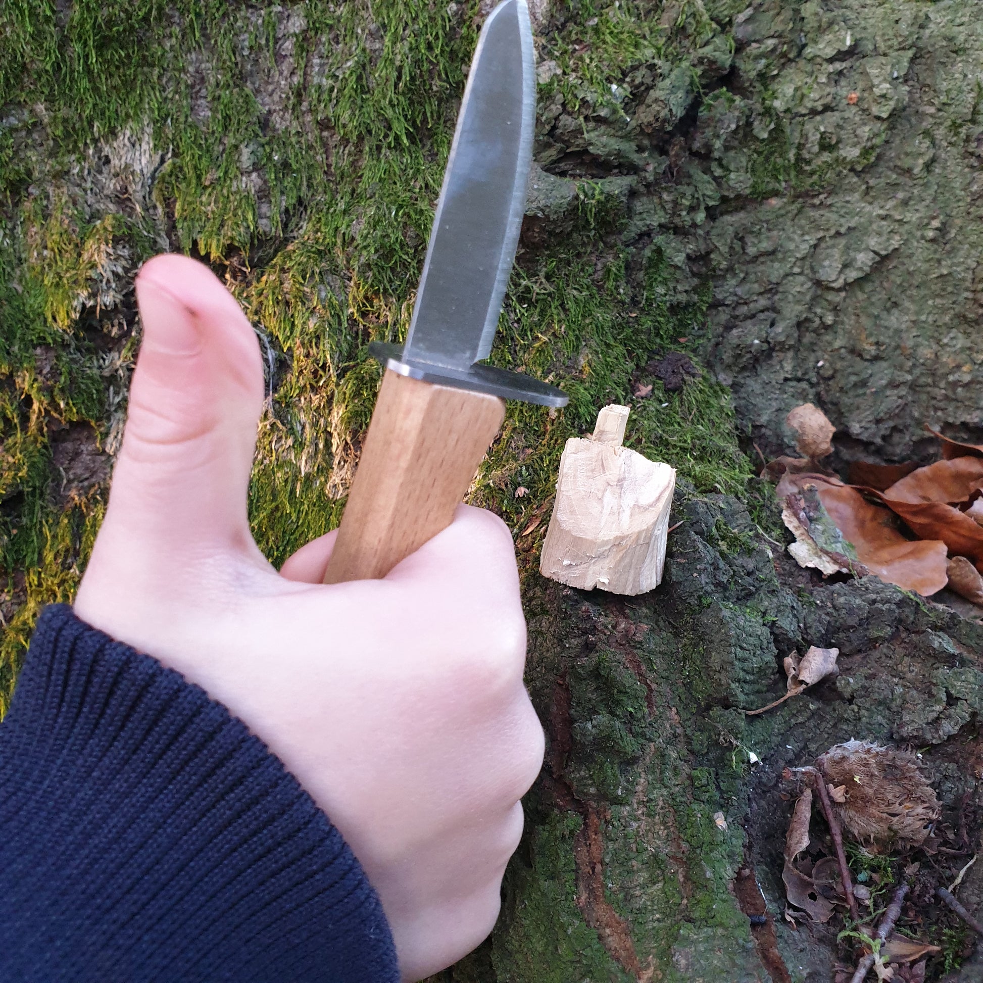 Schnitzen macht immer Spaß – ob bei Sonnenschein oder unter einem Regenschutz bei leichtem Regen. Setzt euch mit den Kindern in die Natur, sucht das richtige Material und legt los. Die robuste Kunstlederscheide sorgt dafür, dass das Messer sicher verstaut werden kann, wenn die Schnitzpause beginnt.