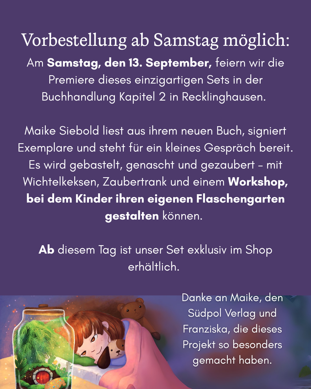 Dieses exklusive Set enthält alles, was kleine Entdecker*innen zwischen 5 und 8 Jahren brauchen, um selbst einen echten Wichtel-Flaschengarten zu basteln – genau wie in der zauberhaften Geschichte „Wichtelzauber im Flaschengarten“ von Maike Siebold.